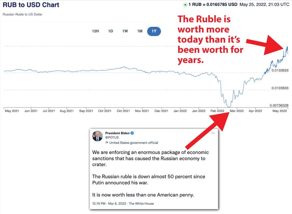 The US had the goal of crashing the Russian Ruble, and for a short time it worked (see Biden’s Tweet below), but then Russia distanced itself from the dollar and the Ruble is now worth more than it has been worth for years. Now Congress has agreed to send over $40 billion to Ukraine. What will be the result? Possibly war - life changing, society crushing, nuclear war.