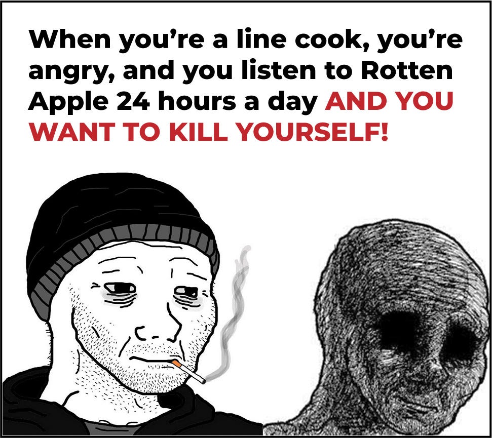 At the end of the day, he got off work and looked at TikTok. On his newsfeed he saw a very strange meme. It was an angry drawing of a chef, and the meme said, âWhen you are a line cook and you listen to Rotten Apple 24 hours a day and you want to kill yourself.â