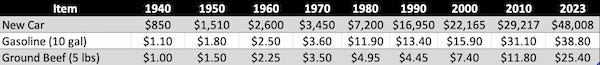 This table tracks, from 1940 to now, the median price of a new car, the price of ten gallons of gas put into that car, and the price of five pounds of ground beef.