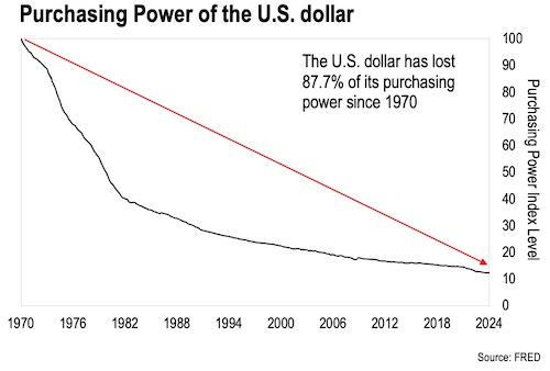 We can see, clear as day, what the Fed and the government have done to our money. They have destroyed nearly 88% of the dollar’s purchasing power since 1970, dramatically driving up our cost of living across the board.