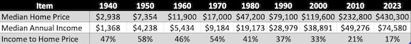 Here, we’re tracking the median home price compared to the median annual income going back to 1940.