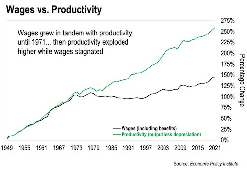 But look at what’s happened since then. Our productivity powered forward, but our inflation-adjusted wages stagnated.