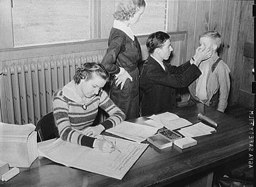 Hookworm examination. Picture attributed to Marion Post Wolcott.