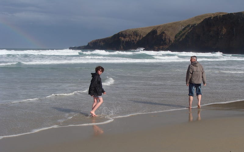 The father’s pant legs were rolled up above his knees so they didn’t get wet as he ran in the surf. The boy’s soaked jeans lay in a heap on the beach, victim of a surprise wave that knocked the boy down. The boy now ran in his underwear. At first he was self-conscious about this, but the beach was deserted so he relaxed.